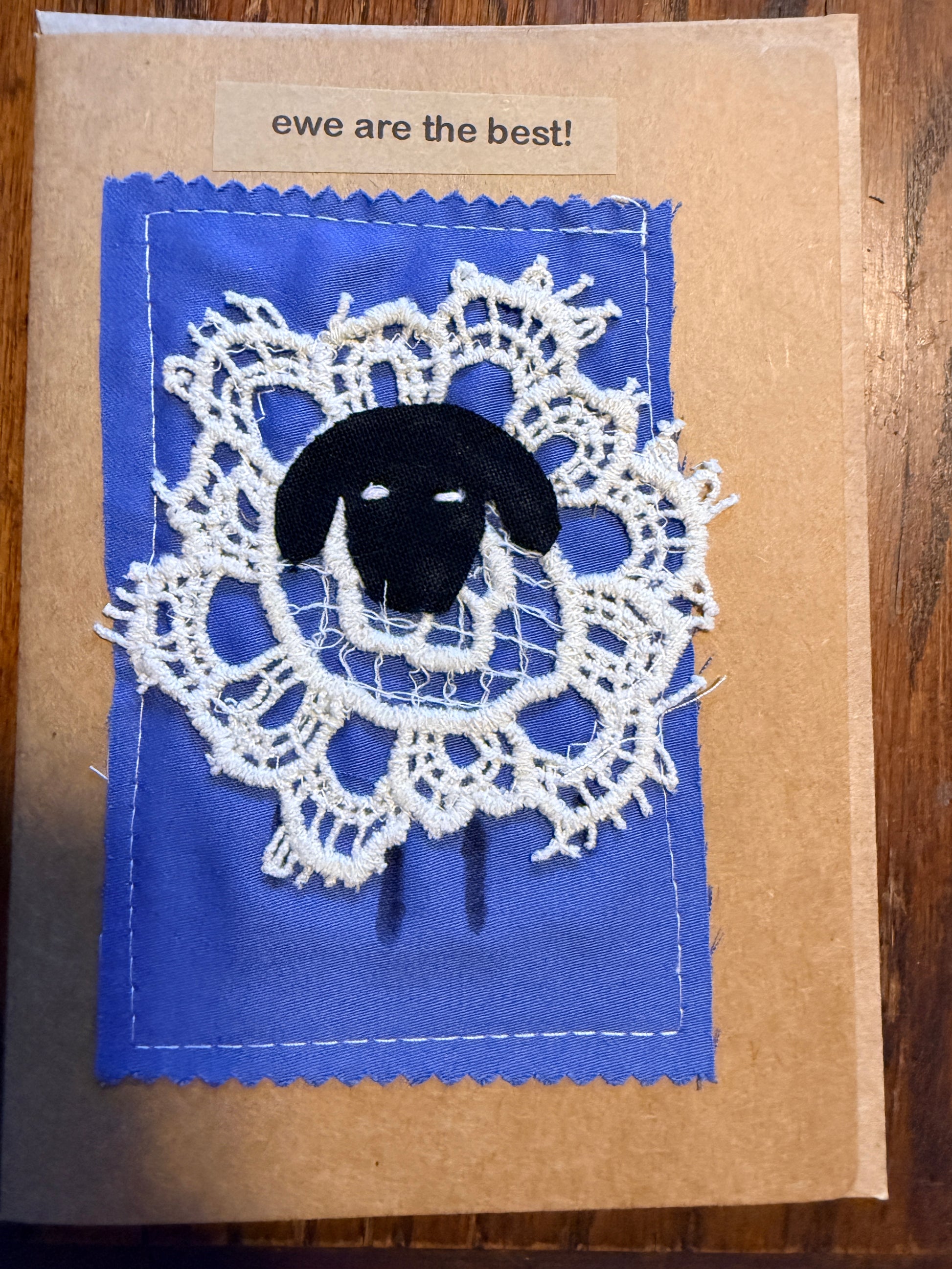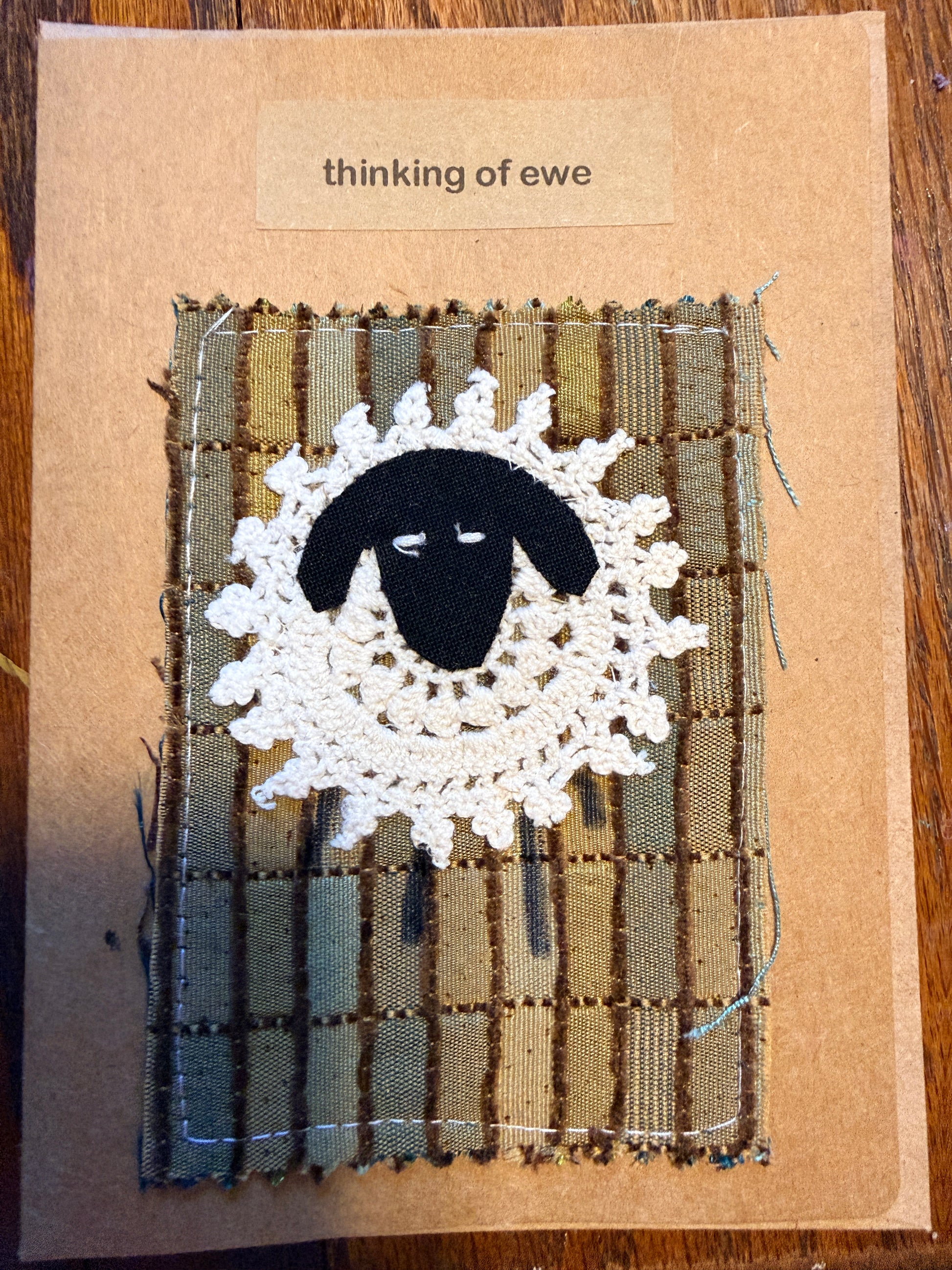 These handmade greeting cards feature charming sheep-themed designs sewn individually with rescued fabrics onto recycled paper. Each card is stitched on a sewing machine, creating a small fabric collage that makes every piece unique.